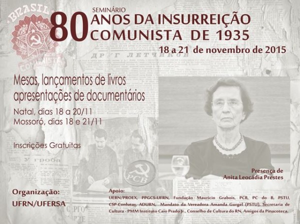 No aniversário de oito décadas do levante antifascista no Brasil, as Universidades Federais do Rio Grande do Norte (UFRN) e a Rural do Semi-Árido (UFERSA) realizam o “Seminário 80 anos da Insurreição Comunista de 1935” entre os dias 18 e 21 de novembro, nas cidades de Natal e Mossoró. O encontro colocará em debate o episódio que contou com a primeira experiência de governo comunista, no Estado do Rio Grande do Norte.