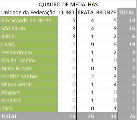 No quadro geral de medalhas, seguindo a regra das olimpíadas esportivas, o Rio Grande do Norte foi o melhor classificado com o maior número de medalhas de ouro, seguido de São Paulo (2), Bahia (2), Ceará, Pernambuco, Rio de Janeiro e Mato Grosso (com 1 medalha cada).