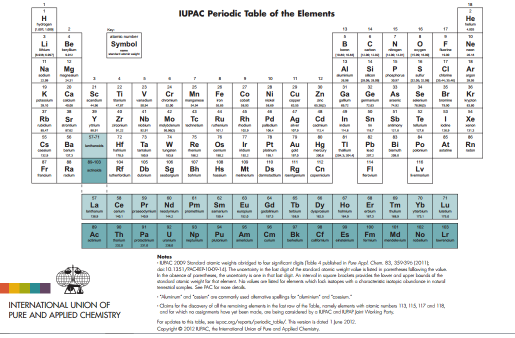 Os elementos 113, 115, 117 e 118 receberam os nomes de Nihonium (Nh), Moscovium (Mc), Tennessine (Ts) e Oganesson (Og), respectivamente, e estão alocados na sétima fila da tabela periódica desde janeiro de 2016.