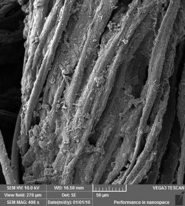 A fibra condutora e bactericida de Oliveira e seus colaboradores é feita de um material compósito, formado por linhas de algodão de 0,5 mm de diâmetro, revestidas com nanotubos de carbono e polipirrol. O material resultante apresenta, além de alta condutividade elétrica, boa atividade eletroquímica – característica necessária para que possa ser usado em supercapacitores.
