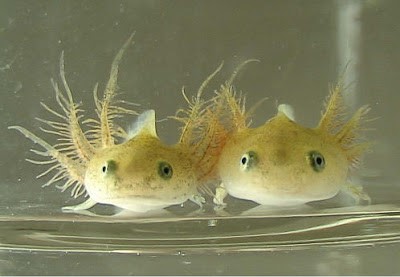 Essa coisa de mudar a cabeça é pra quando a festa tá boa mas às vezes a coisa pode ficar feia pro lado dos girinos dessa salamandra. Acontece que lá no Japão, nas poças aonde estes caras ficam, também tem uma larva de libélula que acha esses girinos bem apetitosos. Mas o grande lance é que as larvas de libélula tão do lado de fora d’água e ai quando tem muitas destas predadoras por perto os embriões desenvolvem brânquias maiores (vejam na foto o embrião da esquerda que foi criado na presenca de larvas de libélula) que possibilitam que estes malandros fiquem mais distantes da superfície e aguentem um ambiente com menos oxigênio.