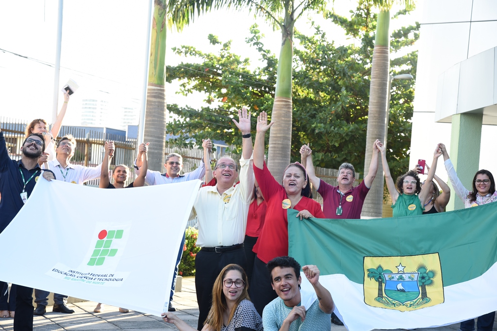 A governadora do Rio Grande do Norte, Fátima Bezerra, juntamente com o vice governador, Antenor Roberto, e o secretário da Educação, Getúlio Marques, estiveram presentes, na tarde desta terça-feira (14), à Reitoria do Instituto Federal do Rio Grande do Norte (IFRN). O momento teve como objetivo reforçar o apoio do Governo do Estado contra o bloqueio de 30% nos recursos orçamentários das instituições federais de ensino em 2019, anunciados recentemente pelo Ministério da Educação. Também participaram do momento, encerrado com um abraço simbólico, os servidores da Reitoria, efetivos e terceirizados, estagiários, bolsistas, representantes do Sinasefe Natal e a deputada estadual Isolda Dantas.