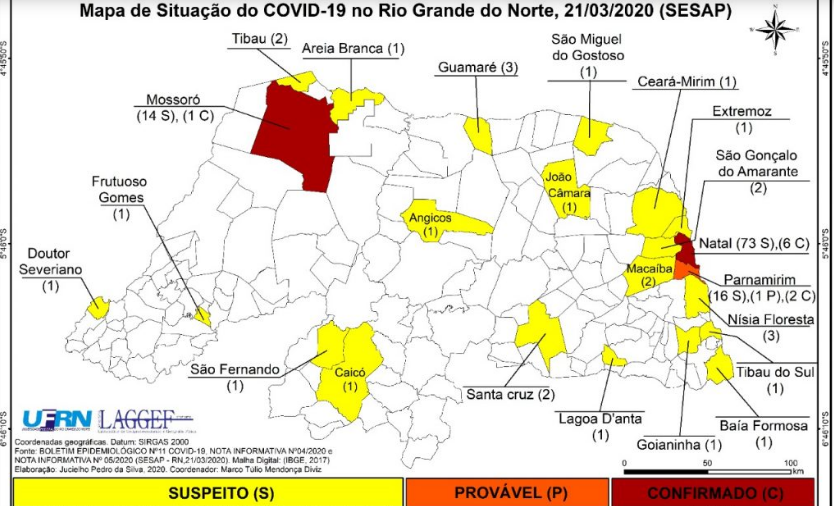 Os dados divulgados pelas secretarias municipais e estaduais de saúde do país e do Ministério da Saúde sobre os números de casos suspeitos e confirmados do Covid-19 são transformados em mapas e gráficos pela UFRN. O trabalho está sendo realizado pelos grupos de pesquisa Georisco (Dinâmicas Ambientais, Riscos e Ordenamento do Território), que faz parte do Núcleo Interdisciplinar de Pesquisa sobre Desastres (Nuped), ambos do CCHLA, e o Laboratório de Geoprocessamento e Geografia Física (Laggef), do Ceres em Caicó, que divulgam o material no Instagram. A proposta é facilitar o acesso da população às informações referentes a pandemia, além de servir como base para futuros estudos sobre a propagação do coronavírus no país.