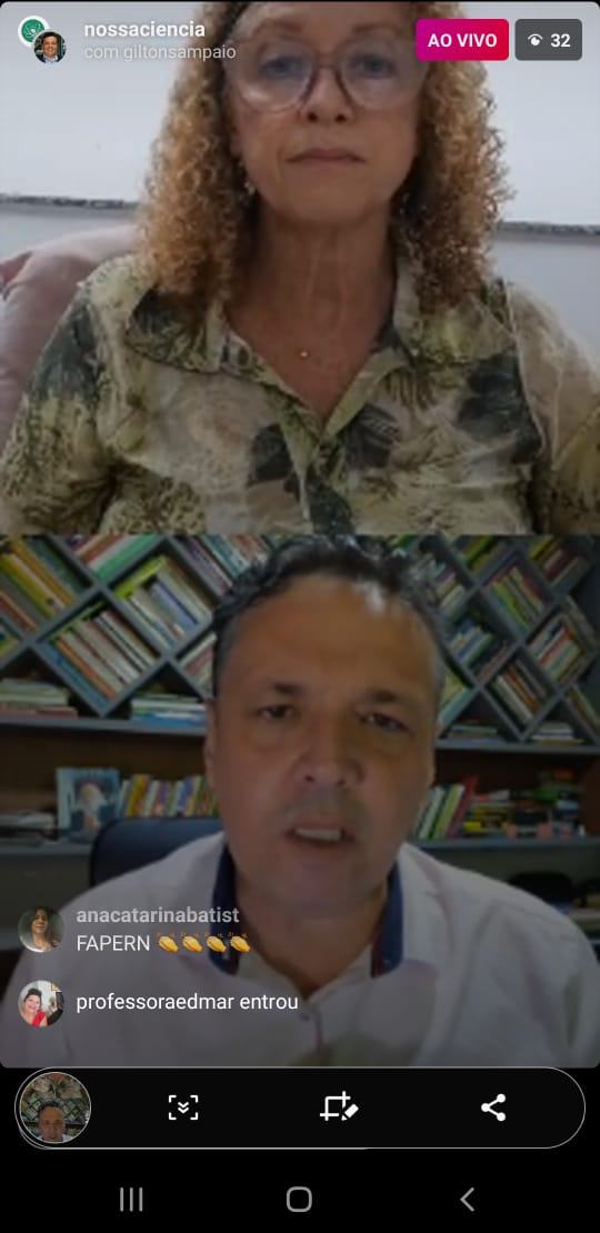 O professor Gilton Sampaio, presidente da Fundação de Apoio à Pesquisa do Rio Grande do Norte (Fapern) foi o convidado da terceira live do Portal Nossa Ciência, realizada ontem (19) às 18 horas. A retomada da Fapern e os próximos editais a serem lançados, ainda este ano, temas do bate papo desta edição, atraiu um público de mais de 140 pessoas.