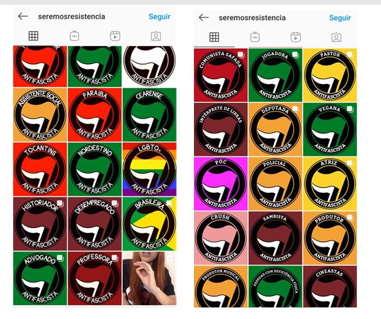 O primeiro caso a ser analisado é a utilização da bandeira antifascista pelo perfil Seremos Resistência nos meses de maio e abril deste ano (2020) durante manifestações nazistas e fascistas que ocorriam no Brasil (imagem que abre esse texto). O perfil se apropriou da bandeira do movimento antifascista e criou mais de 50 visuais diferentes para esta, incorporando cores e nomenclaturas novas. Ao se apropriar da bandeira e alterar suas cores, identificamos certo desrespeito e negligência com a história do movimento antifascista, que construiu sua identidade baseada na aliança entre os movimentos anarquista e comunista.