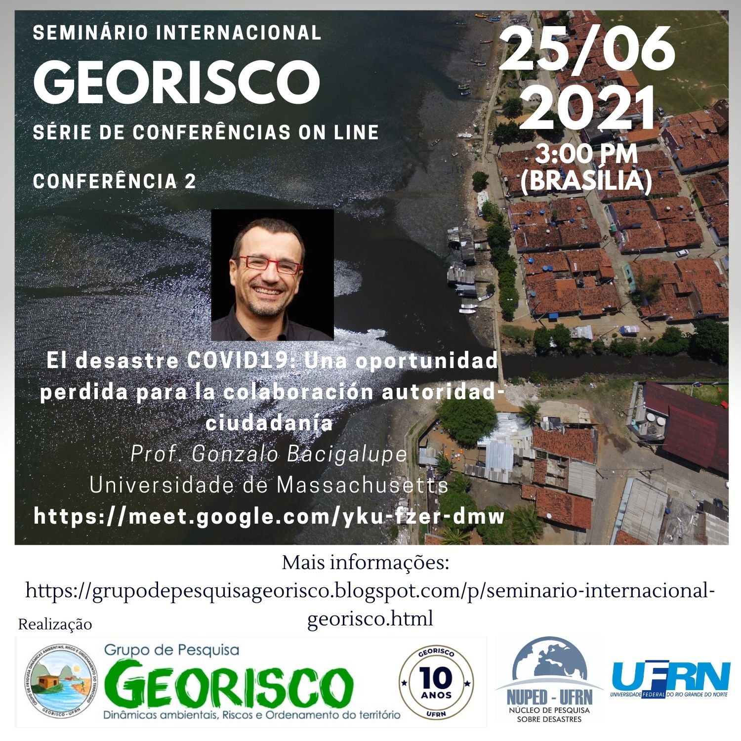 Em meio a uma marca tenebrosa de 500 mil óbitos por COVID-19 no Brasil, o grupo de pesquisa Georisco promoverá conferência com o professor Gonzalo Bacigalupe, da Universidade de Massachusetts (EUA) e do CIGIDEN – Centro de Investigación para la Gestión Integrada del Riesgo de Desastres, dia 25 de junho de 2021, às 15h, sobre o tema El desastre COVID19: Una oportunidad perdida para la colaboración autoridad-ciudadanía.