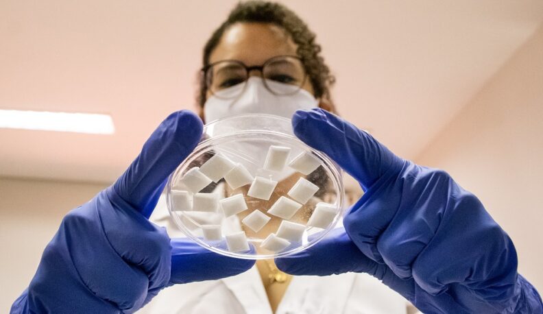 A solução para esses problemas começou a ser desenhada ainda no mestrado de Erika: a pesquisa resultou em dois sistemas de liberação de estrôncio, cada um com uma taxa de liberação diferente. “É como se fossem duas camadas, duas doses. Esse curativo pode ser aplicado para que haja maior liberação de estrôncio em três dias, suficiente para aliviar o trauma. E, depois, a liberação de estrôncio em um gradiente muito menor por até seis meses”, explica o Prof. Rodrigo Vieira, orientador da pesquisa. Os testes para esse sistema foram feitos em laboratório.