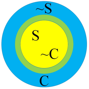 Da mesma forma, considere C como a capacidade de criar e ~C seu oposto. No CSU, quanto mais você acha que sabe, menos você cria. E quanto mais você admite que não sabe, mais você é obrigado a criar para sobreviver. Temos que promover nas escolas a ruptura das zonas de conforto cognitivas, a faixa verde da figura, geradas pela paixão por padrões; pelo amor à especialização.