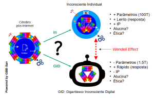 Em Pensando dentro da Caixa, conhecemos o poder do inconsciente para resolver problemas complexos. Assim, um caminho é aprender a jogar o caminhão de informações que nos é ofertado pra dentro da caixa, para que o inconsciente cumpra seu papel (caminho “In” da figura). O segundo é utilizar o GID, o gigantesco inconsciente digital, que nada mais é do que tudo que a humanidade produz depositado de um modo pseudoaleatório, e por isso que chamo de inconsciente, gerenciado por algoritmos de IA. Esse é o caminho “GID” na figura.