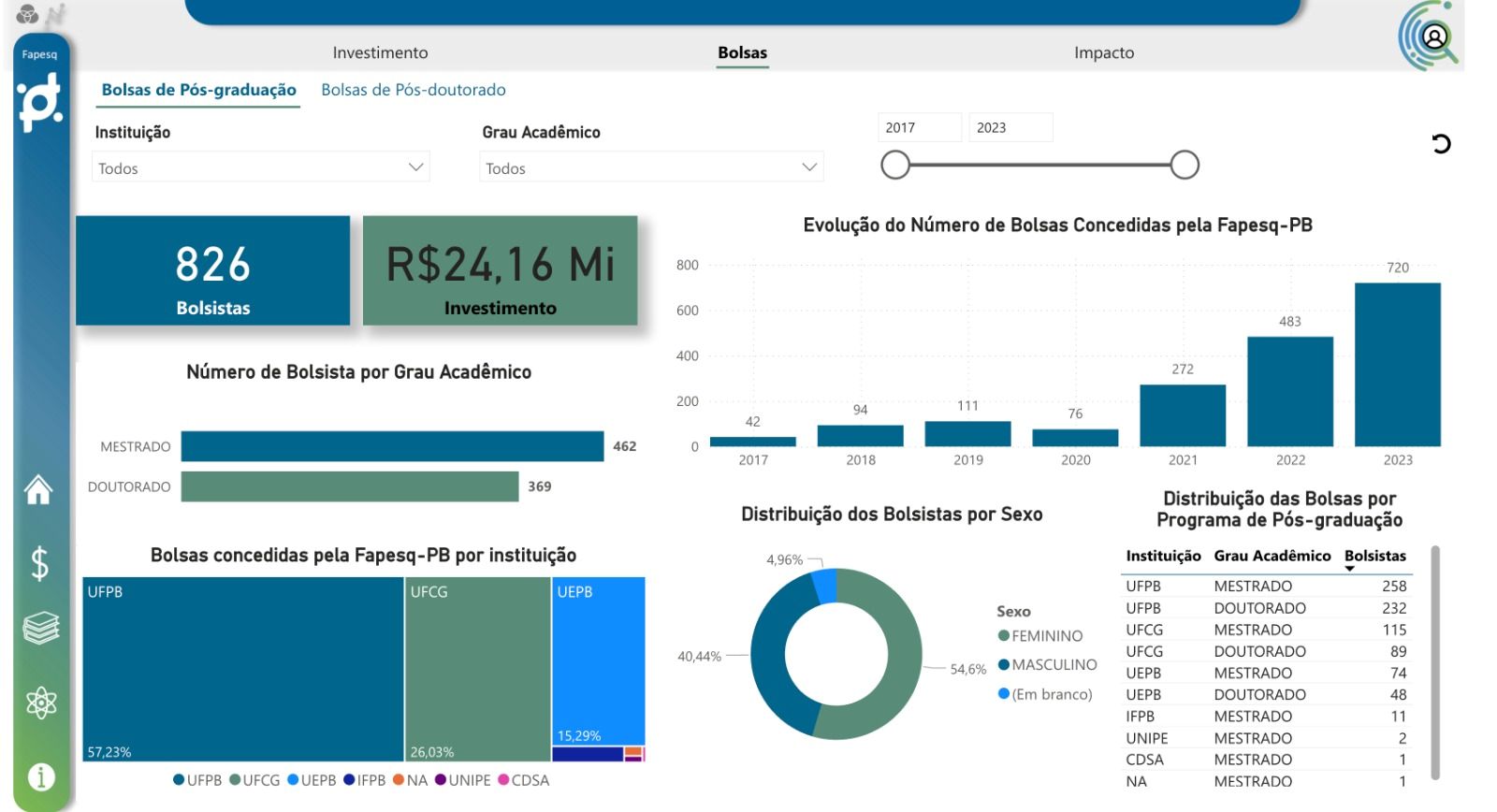Uma ferramenta desenvolvida pelo Laboratório de Estudos em Modelagem Aplicada da Universidade Federal da Paraíba (LEMA/UFPB) indica que o estado vem se consolidando como polo de excelência em pesquisa e pós-graduação. Informações repassadas pela Fundação de Apoio à Pesquisa do Estado da Paraíba (Fapesq), órgão do Governo do Estado, mostram que entre 2019 e 2023, houve um crescimento de 548,6% na concessão de bolsas para novos mestres e doutores. O investimento anual da Fapesq passou de R$ 473 mil, em 2019, para R$ 14,11 milhões em 2023 — crescimento de 105% apenas no último ano.