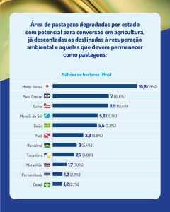 Os números observados no Brasil indicam que esse montante seria compatível com energia renovuma política que visa eliminar o desmatamento e recuperar áreas naturais, além de expandir a agricultura de alimentos e de outras matérias-primas. Dos 100 milhões de hectares (Mha) de pastos degradados existentes no Brasil — o que equivale a 12% do território nacional —, 56 milhões poderiam ser estrategicamente direcionados para a expansão da agricultura brasileira, incluindo o cultivo de biocombustíveis. A pesquisa do IEMA mostra que a expansão de áreas de cultivos agrícolas para aumento da produção de biocombustíveis pode ser compatível com o “estoque” de áreas degradadas que o país já possui. “Para isso, é necessário que haja uma aposta em cultivos de maior produtividade, como a macaúba, e o investimento em novas tecnologias, como o etanol de segunda geração”, ressalta Silva.