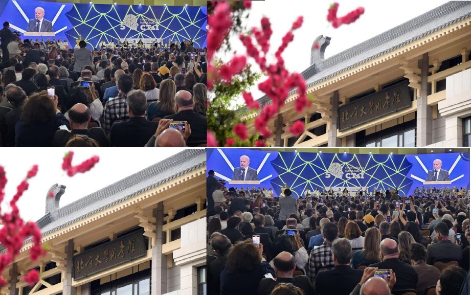 Imagem: Montagem com a Biblioteca da Universidade de Pequim e o lançamento do Plano Brasileiro de Inteligência Artificial 2024-2028 durante a 5ª Conferência Nacional de CTI.