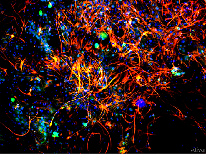 Imagem de células primárias de ratos, produzida por meio de microscopia de fluorescência por Maíra Assunção Bicca e Evelyn Cristina da Silva Santos, da UFSC http://bit.ly/2N0Cl2B